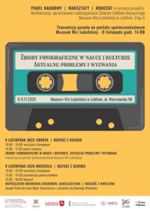 W dniach 8 i 9 listopada 2025 r. w Muzeum Wsi Lubelskiej w Lublinie odbędzie się wydarzenie podsumowujące projekt: Archiwizacja, opracowanie i udostępnianie Zbiorów Folkloru Muzycznego Muzeum Wsi Lubelskiej w Lublinie. Etap II, realizowany w ramach Programu Kultura ludowa i tradycyjna 2025.